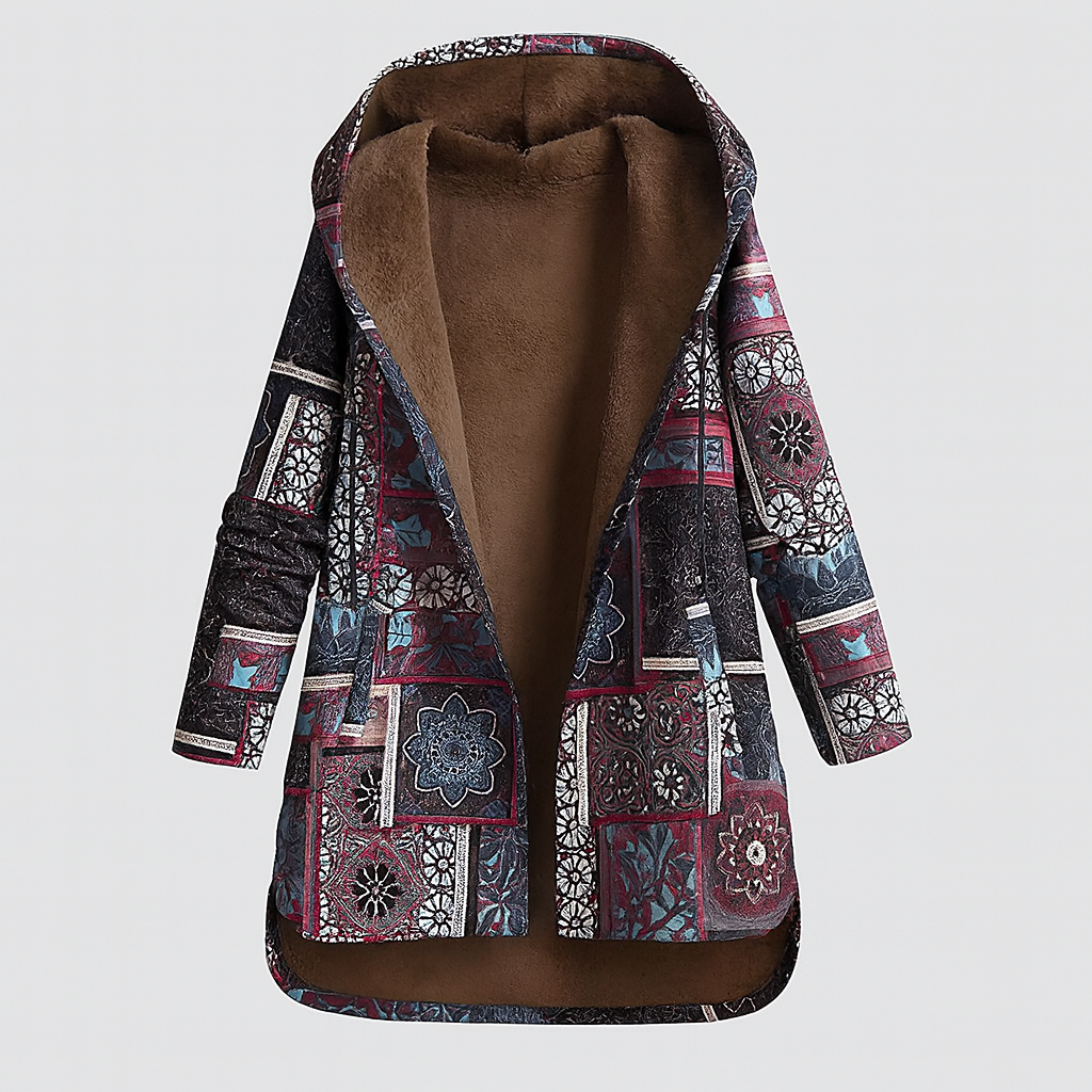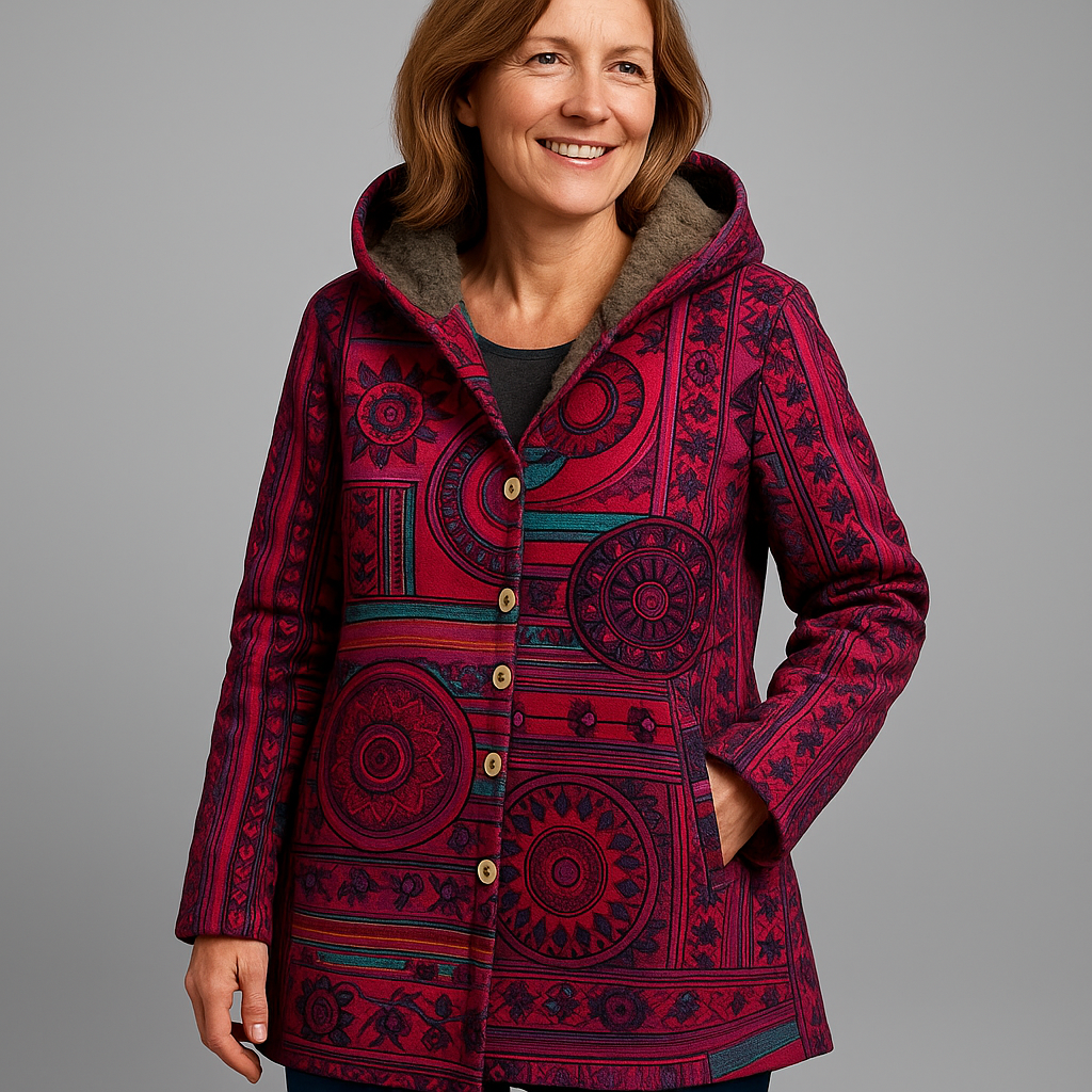 Diese einzigartige Damenjacke vereint auffälliges Design mit angenehmer Wärme. Der farbenfrohe, geometrisch inspirierte Print macht die Jacke zu einem echten Hingucker, während das weiche Teddyfutter im Inneren für kuschelige Behaglichkeit sorgt. Mit Kapuze und lässigem Schnitt ist sie der ideale Begleiter für kühle Tage – ob beim Spaziergang, Stadtbummel oder gemütlichen Treffen mit Freunden.
