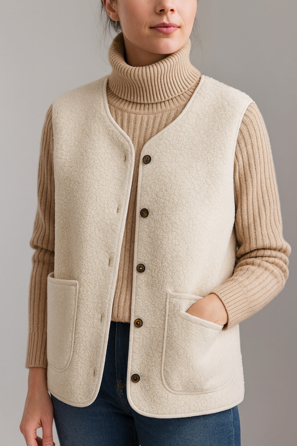 Diese Weste besteht aus einem weichen, strukturierten Material und ist vorne mit einer Knopfleiste ausgestattet. Zwei aufgesetzte Taschen ergänzen das praktische Design und bieten Platz für kleine Gegenstände. Der gerade Schnitt sorgt für eine bequeme Passform, während die schlichte Ausführung vielseitige Kombinationsmöglichkeiten eröffnet.